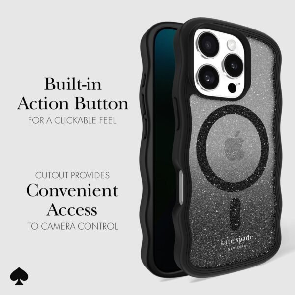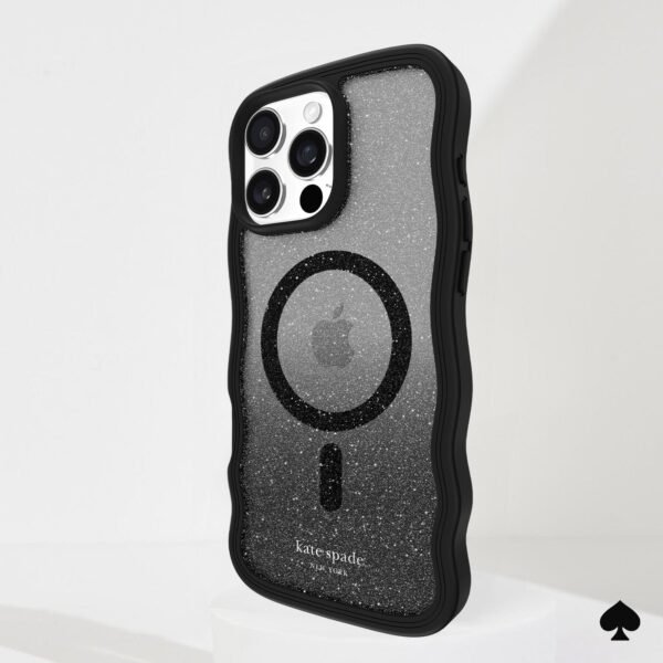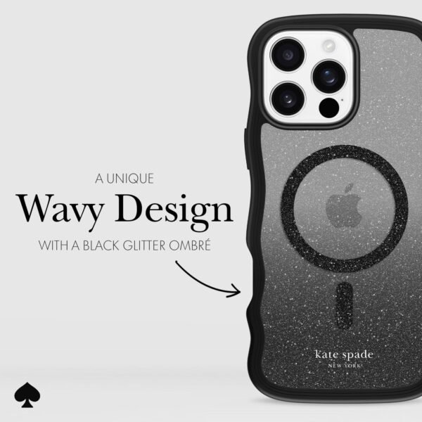 The kate spade new york Wavy MagSafe Phone Case adds a fun touch to your mirror selfies with a unique wavy design and black glitter ombré! This phone case is made to keep up with your daily to-do list thanks to 12-foot drop protection. while built-in magnets let you wirelessly charge and accessorize in a snap.