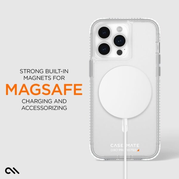 Stay strong. stay protected. The Tough D3O® Clear case is built to last day and night for ultra-strong phone protection. D3O® uses a self-strengthening. non-Newtonian technology that offers the thinnest. strongest. and the world’s best impact protection. The science behind this material is incredible– so yes. you can really drop it. With added D3O® protection. feel confident your phone is safe with 16-foot drop protection. Strong built-in magnets allow for easy MagSafe accessorizing and charging.